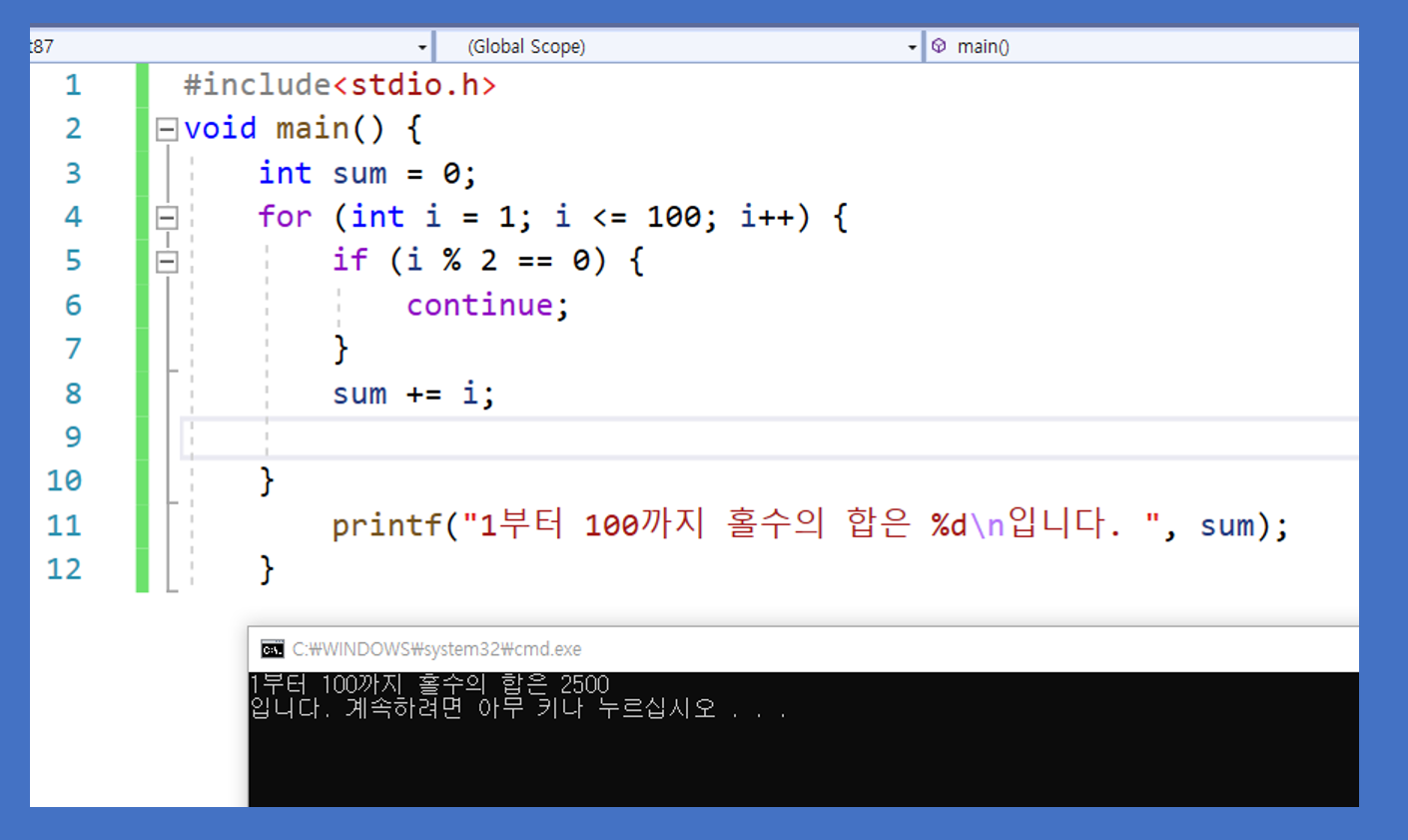 if조건문을 보면 2로 나누어서 나머지가 2인 경우 즉 짝수인 경우는 더해지지않고 for문의 증감식으로 진행합니다. 이는 다시 말해 해당 조건을 만족하는 경우는 건너 뛰는 역할을 합니다.