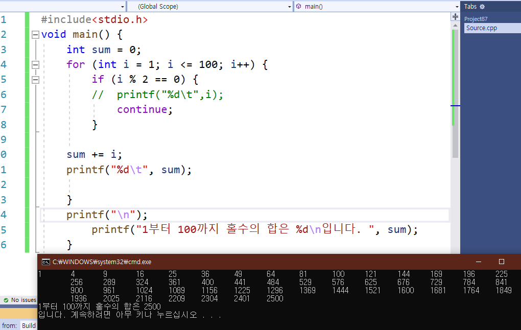 printf("1부터 100까지 홀수의 합은 %d\n입니다. ", sum);
