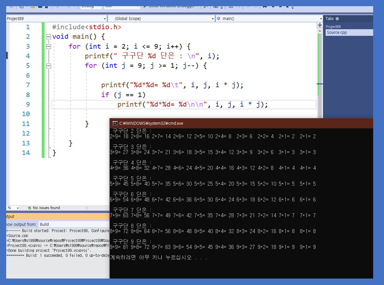 한 화면에 다 보이는 구구단을 출력하기 위해서 개행(줄바꿈)을 줄여서 나타내겠습니다.