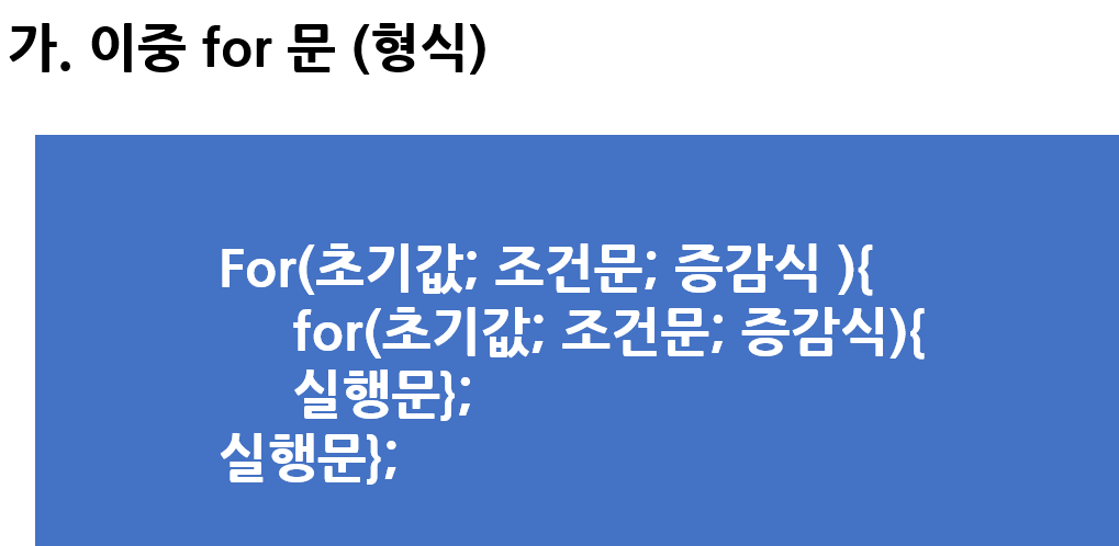 이중for 문은 반복문 for 안에 또 다시 반복문 for 문이 들어 있는 것을 말합니다.