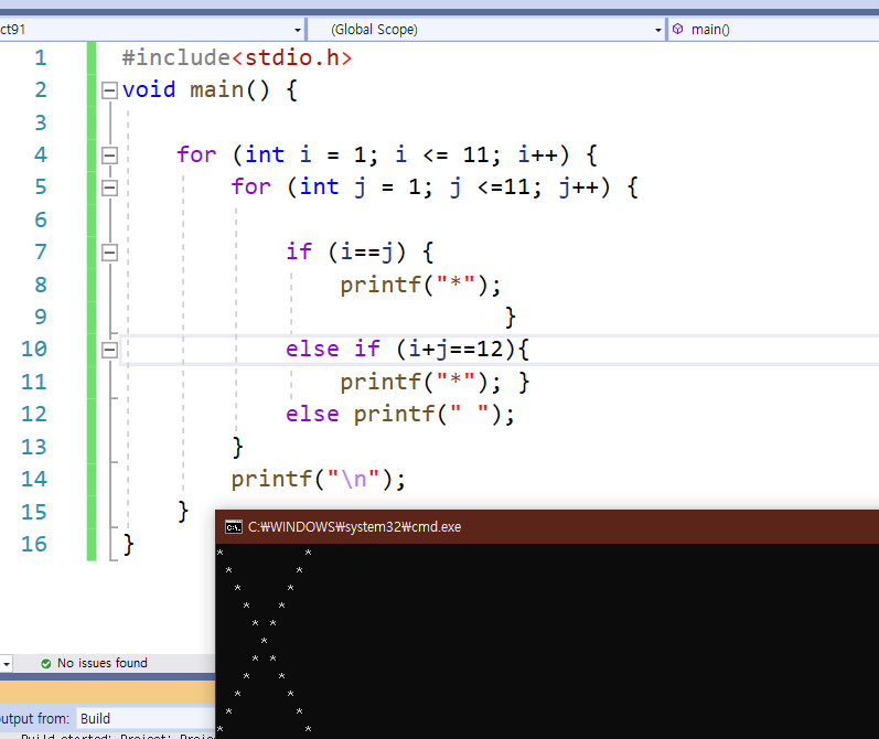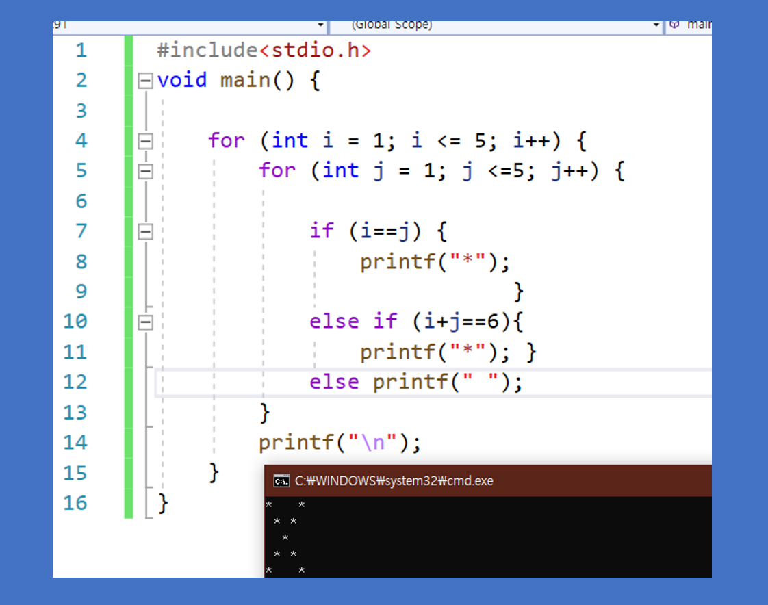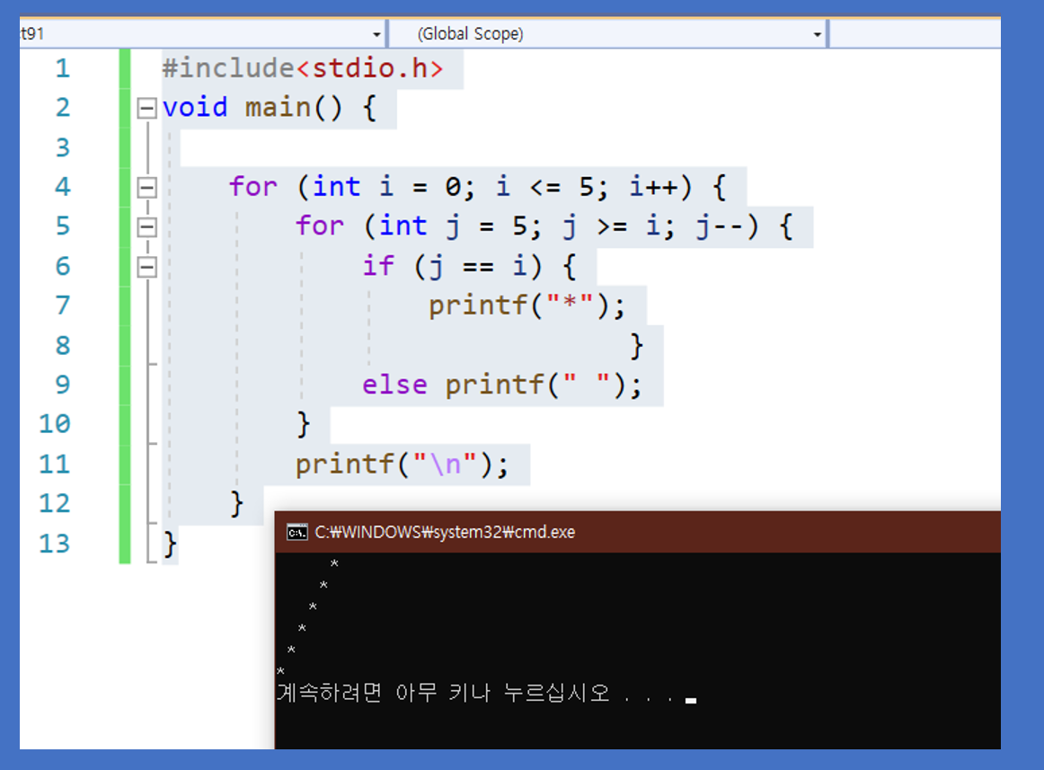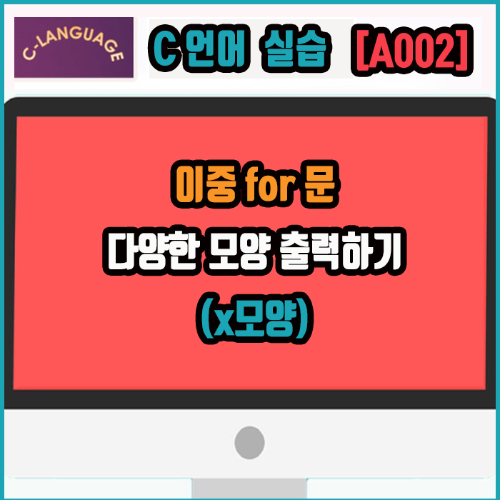 c언어 실습 <a002> 이중 for 문을 이용한 다양한 모양 출력하기이중 for 문을 이용한 다양한 모양 출력하기 (x모양)를 통해 실습해 보겠습니다.