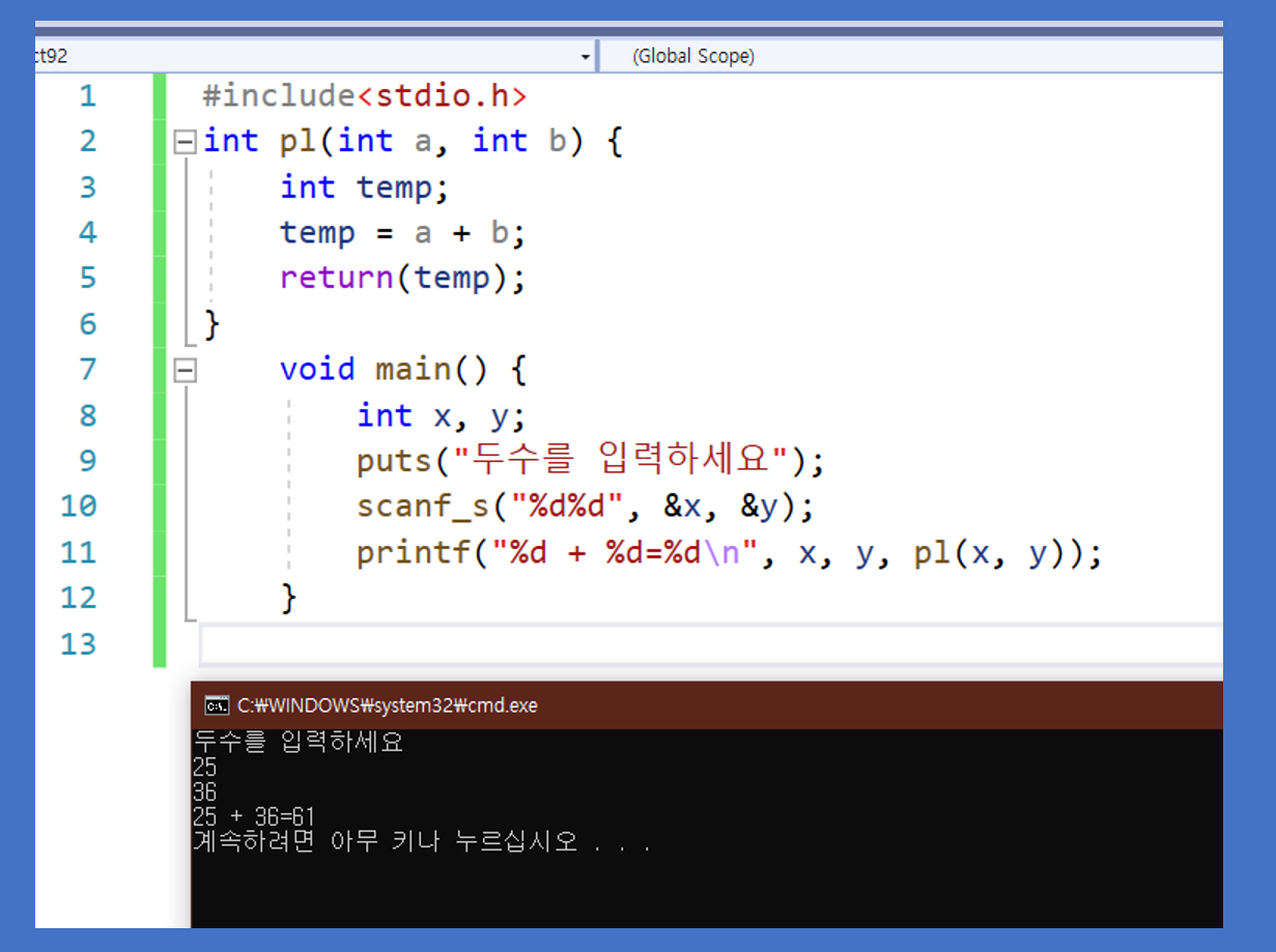 이는 두 수 즉 25와 36을 입력받고 (4) 번을 진행하려고 보니 pl(x,y)가 있어서 (3) 번의 사용자 정의 함수로 두 값을 가져가서 return 값 즉 두 수를 더한 값 즉 61을 가지고 와서 출력을 하게 됩니다.