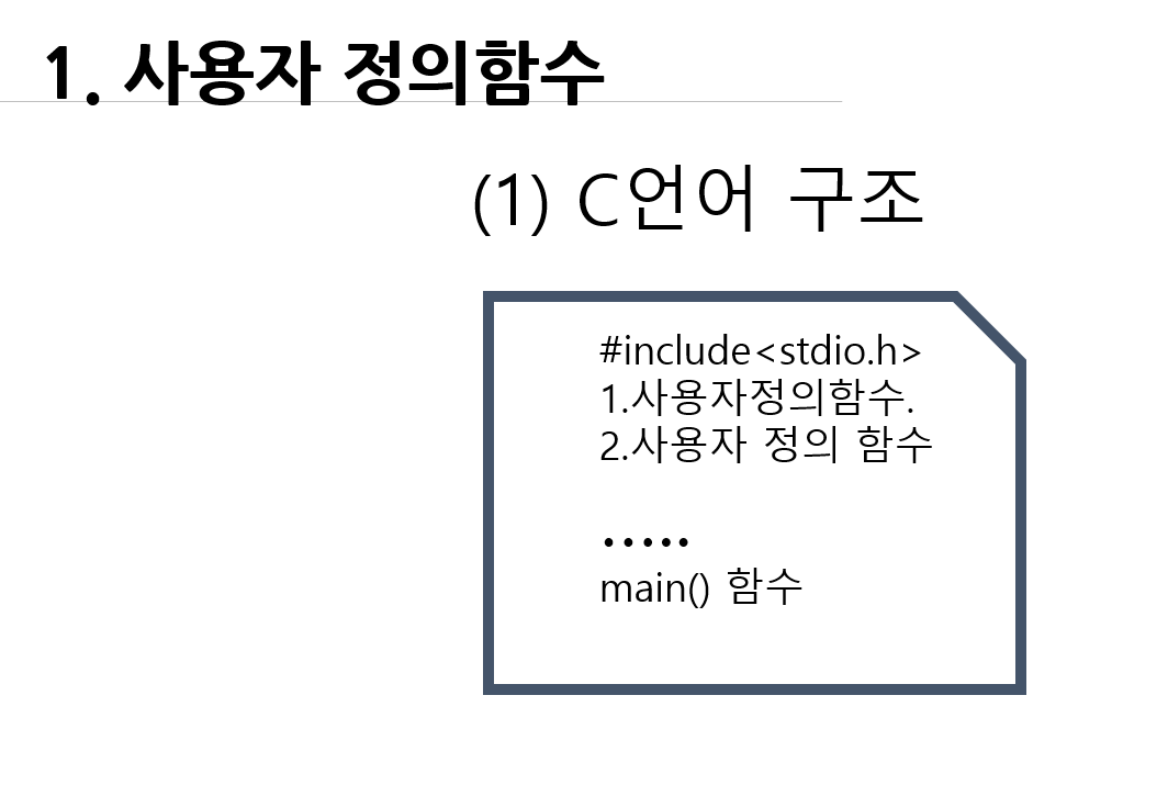 다시 사용자 함수로 돌아와서 사용자 정의 함수란 사용자가 미리 정의해서 놓은 것을 main ()함수에서 불러서 호출하여 우리가 원하는 값을 출력하는 것입니다. 다시 말해 사용자 정의 함수는 main() 함수 앞에 작성되어야 합니다.