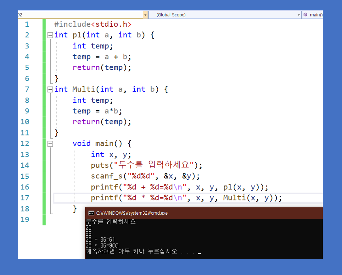 오늘은 사용자 정의 함수에 대해 알아보겠습니다. 배열과 함께 사용자 정의 함수는 c언어를 이해하는데 상당히 중요합니다. 사용자가 원하는 함수를 직접 만드는 것이기 때문에 기존에 우리가 알던 함수와 더불어 우리의 필요에 의해서 만들어서 사용하기 때문에 그 형식을 우선 이해하고 다음에 실질적으로 다양한 함수를 만들어 사용하면 됩니다.