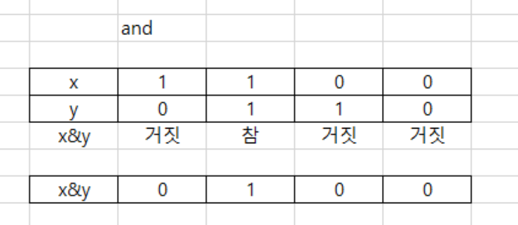 AND는 해당 비트에둘다 1이 있어야 1이 되는 연산입니다. 연산자에서 1은 참이고 0은 거짓으로 표현합니다. 즉 정수값이 나오는 경우는 참이 됩니다. 이를 표로 보면 다음 같습니다.