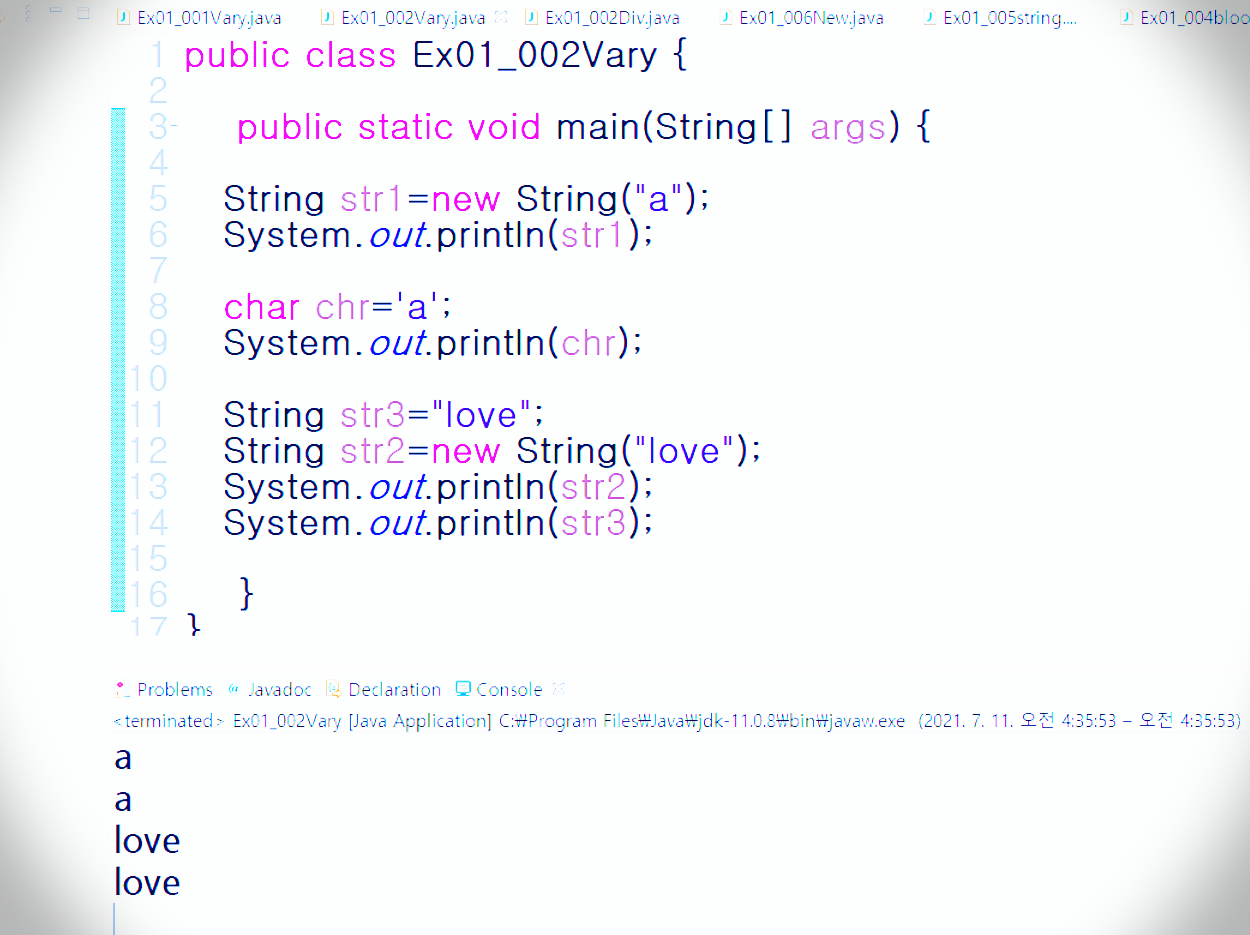 문자열 변수를 선언할때 String str1=new String("a"); 으로 선언할 수도 있고, String 변수=" 문자열" 형식으로 선언할수도 있습니다.