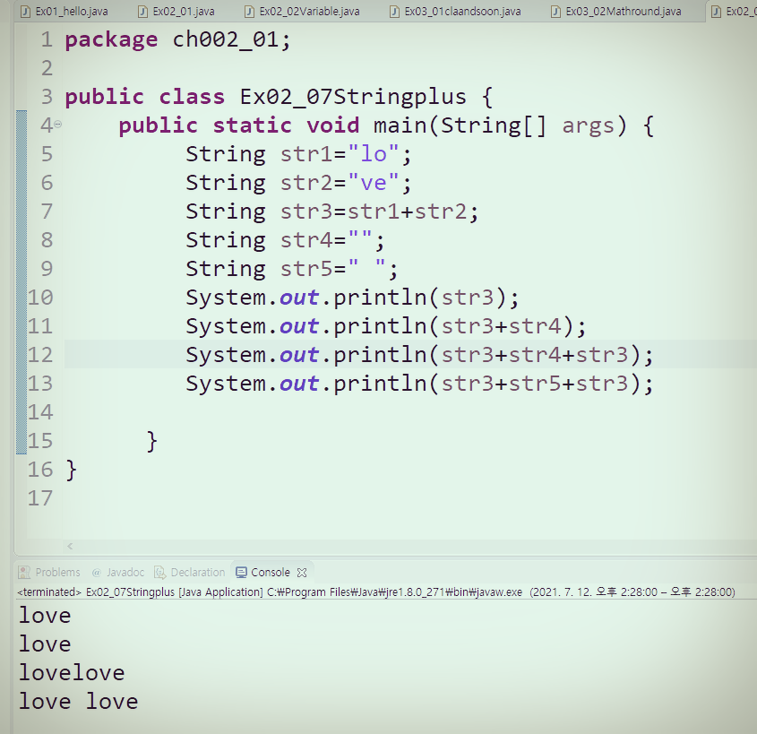String str3의 경우 str1+str2 이 때문에 함게 출력이 되어 글자 love 로 출력됩니다.