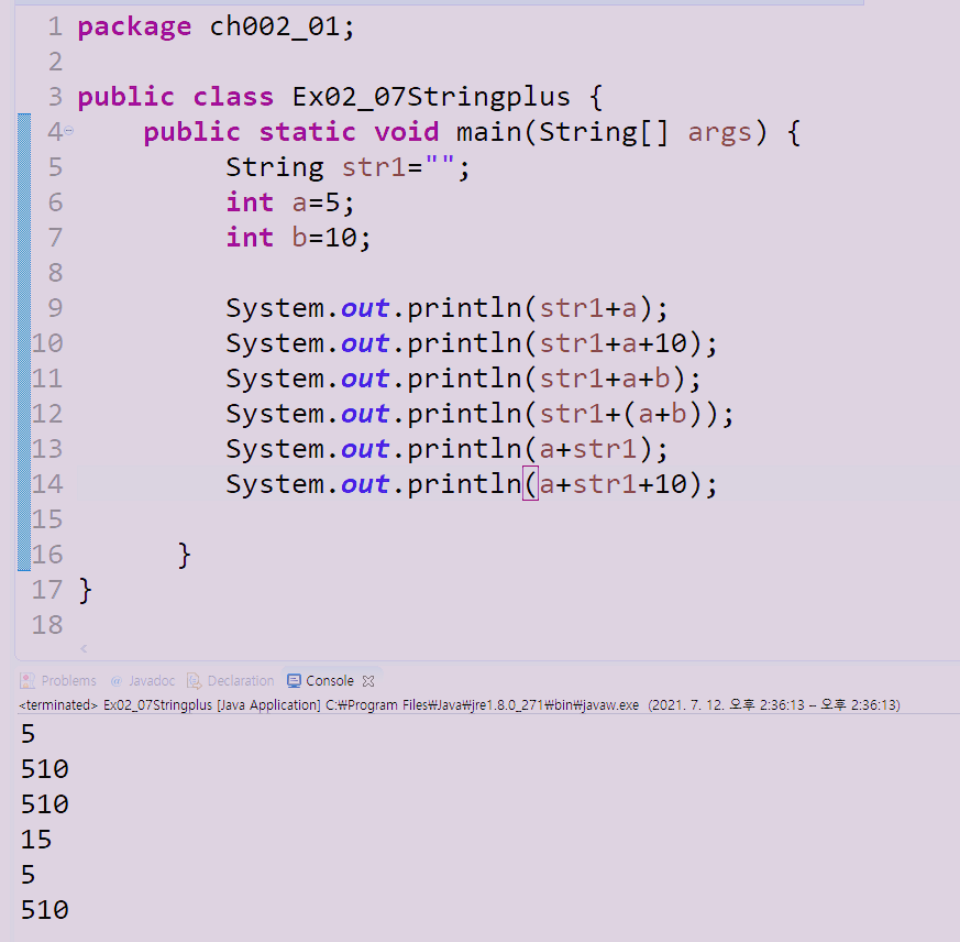 System.out.println(str1+(a+b)); -->int 형이 먼저 연산이되기 때문에 덧셈이 되고 다음에 문자열로 변형되어 문자열 15 로 출력