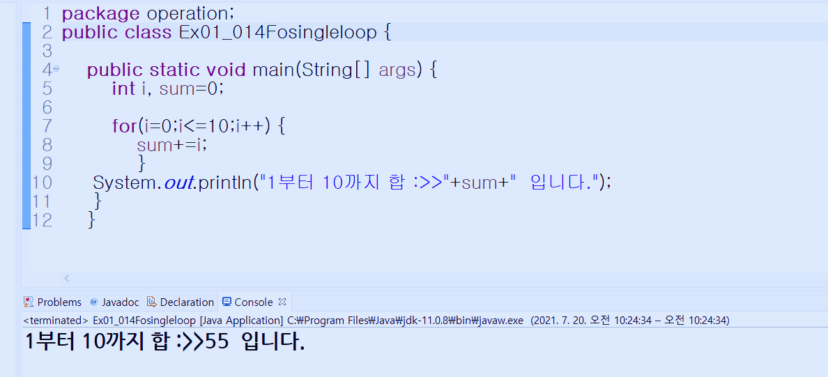 자바기초 # 012. 반복문(1) for문 single loop 이해하기 1부터 10까지 합 구하기, 1부터 100까지 합 구하기를 알아보겠습니다.