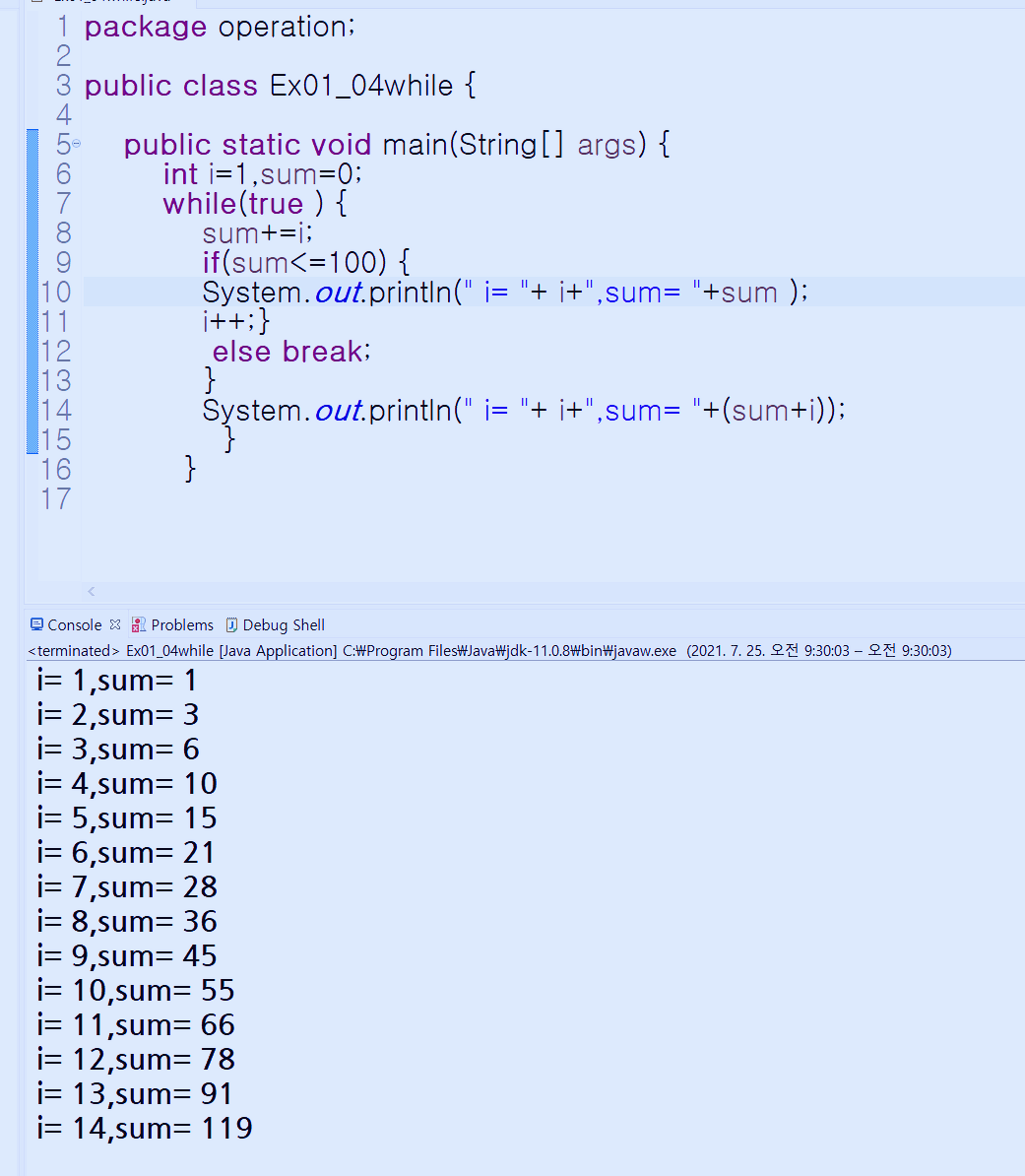 while 조건을 true 대신에 while(sum<=100)로 했습니다. if 절과 동일하게 말이지요.