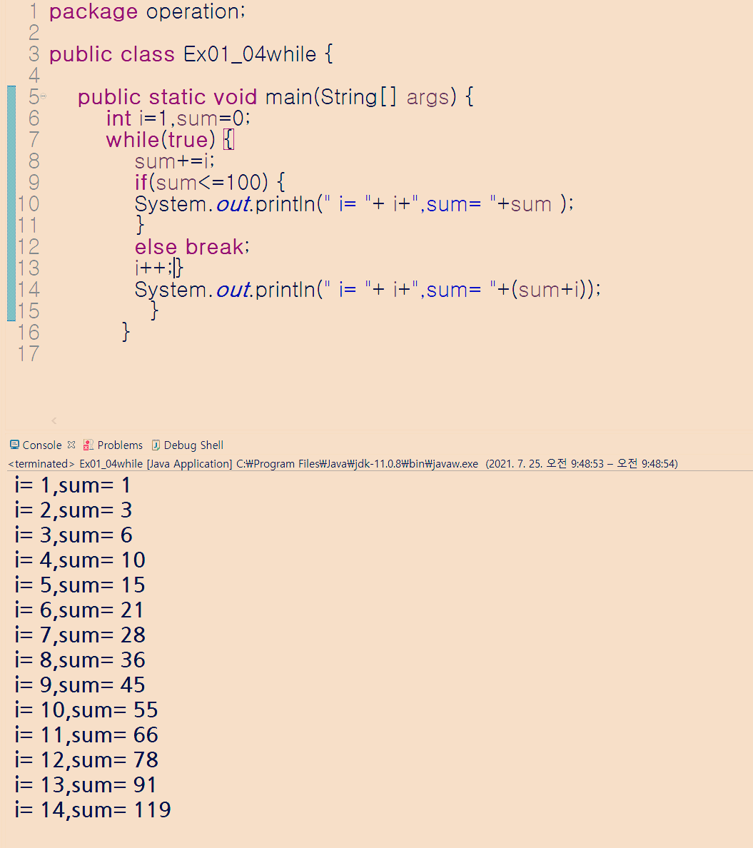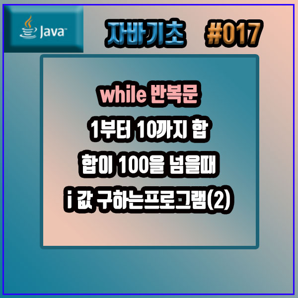 제한 조건이 있어서 wihile문을 벗어났을때 다시 한번 i 값과 sum 값을 출력하여 sum이 100을 넘긴 i값을 확실히 알 수 있게 했습니다.