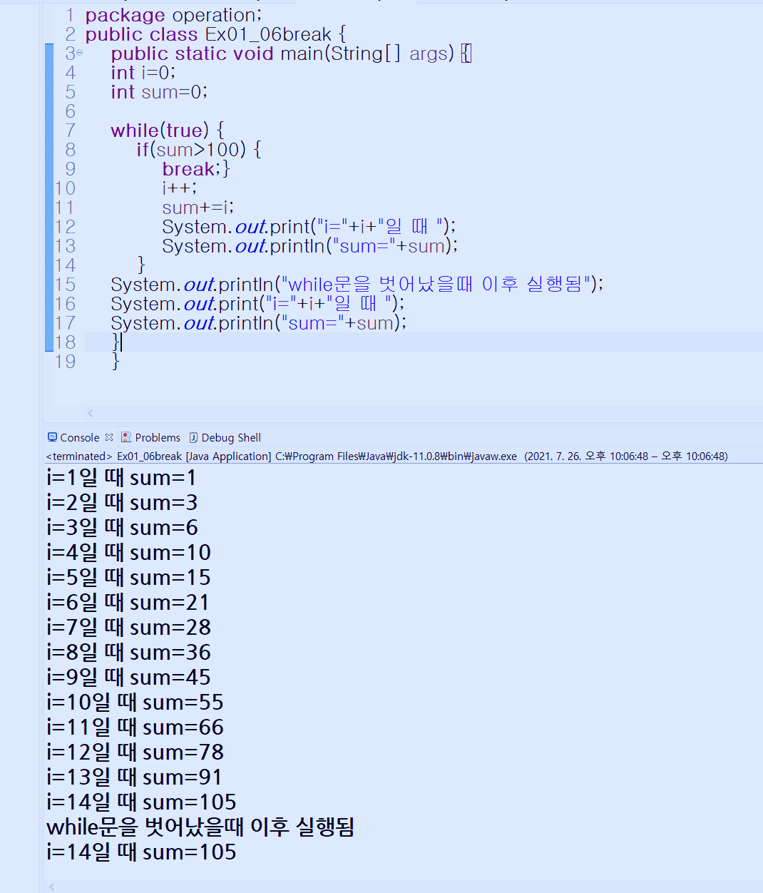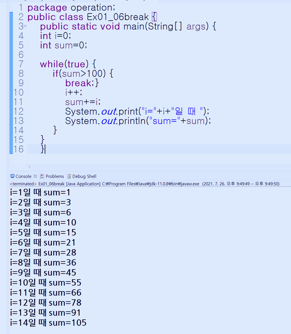 i=14일때 까지 출력하고 그 때 sum 값은 105가 됩니다. 그럼 while(sum>100)을 만나게 되어 조건을 만나서 break 가 되어 while문을 벗어나게 됩니다.