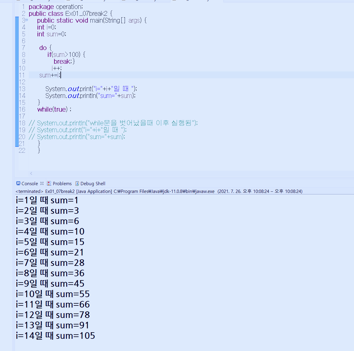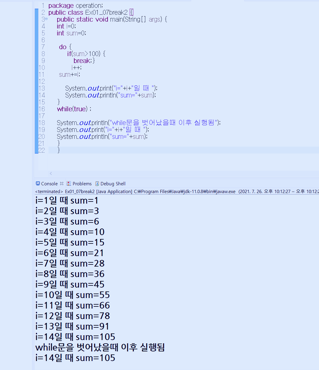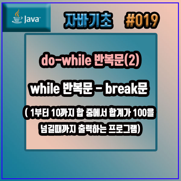 자바기초 # 019. do-while 반복문(2) , while 반복문 - break문 ( 1부터 10까지 합 중에서 합계가 100을 넘길때까지 출력하는 프로그램) 에대해 알아보겠습니다.