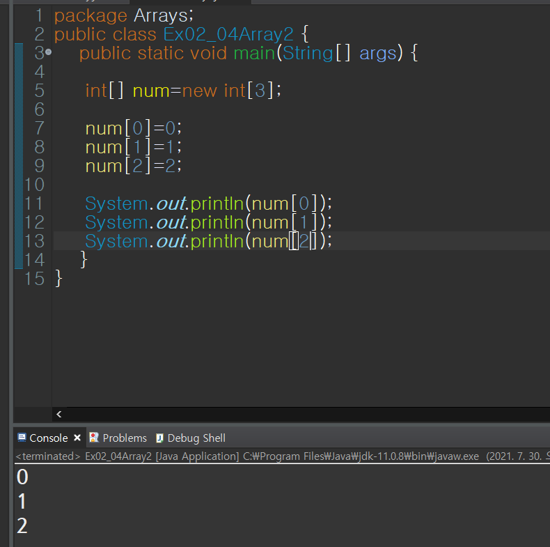 for(int i=0;i<=2;i++) {System.out.println(num[i]); } 배열의 값 즉 인덱스에 있는 값을 출력하는 방법은 반복문을 활용하는 방법이 가장 코드가 짧습니다. 코드를 간단하게 작성하는 방법을 고안하고 연구하는 것이 바로 프로그래밍의 지름길이 아닌가 생각합니다.