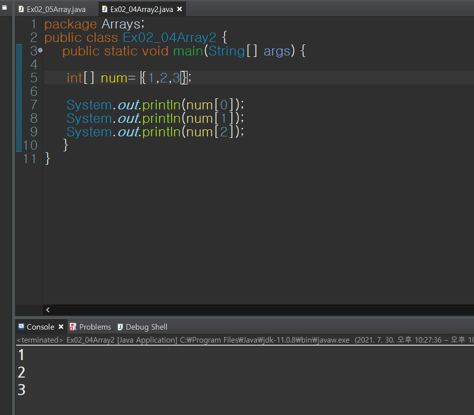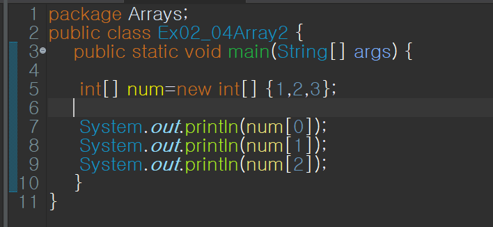 int[] num=new int[] {1,2,3}; 이 방식은 배열을 선언하는 가장 기본적인 방식이고 많이 사용하는 일반적인 방식입니다. 코드가 간단하면서 이해하는데 어려움이 없습니다. new 연산자가 있어서 바로 배열이란 것을 알 수 있습니다. 인덱스 0번부터 2번까지 값을 직접 넣어줍니다.