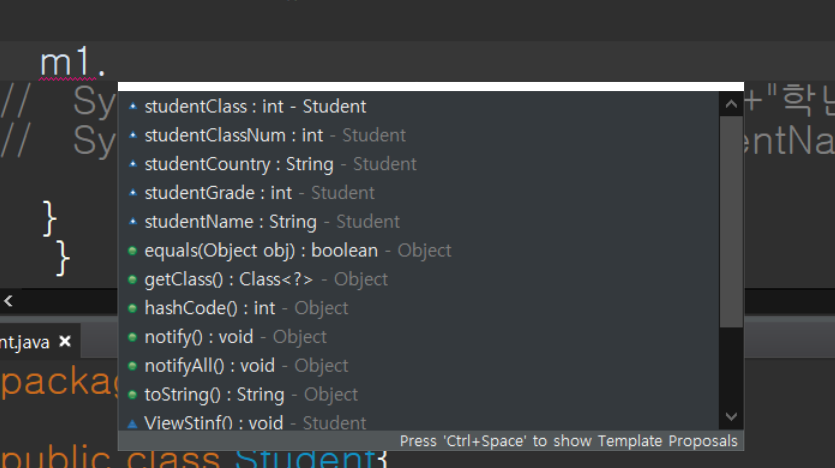Student m1= new Student(); 즉 new 연산자를 활용하여 참조변수를 만들어서 Studentclass에 있는 멤버 변수와 메서드를 활용하도록 하였습니다.