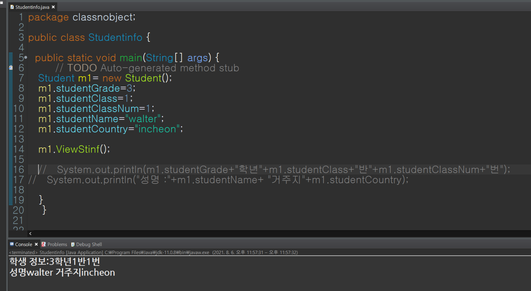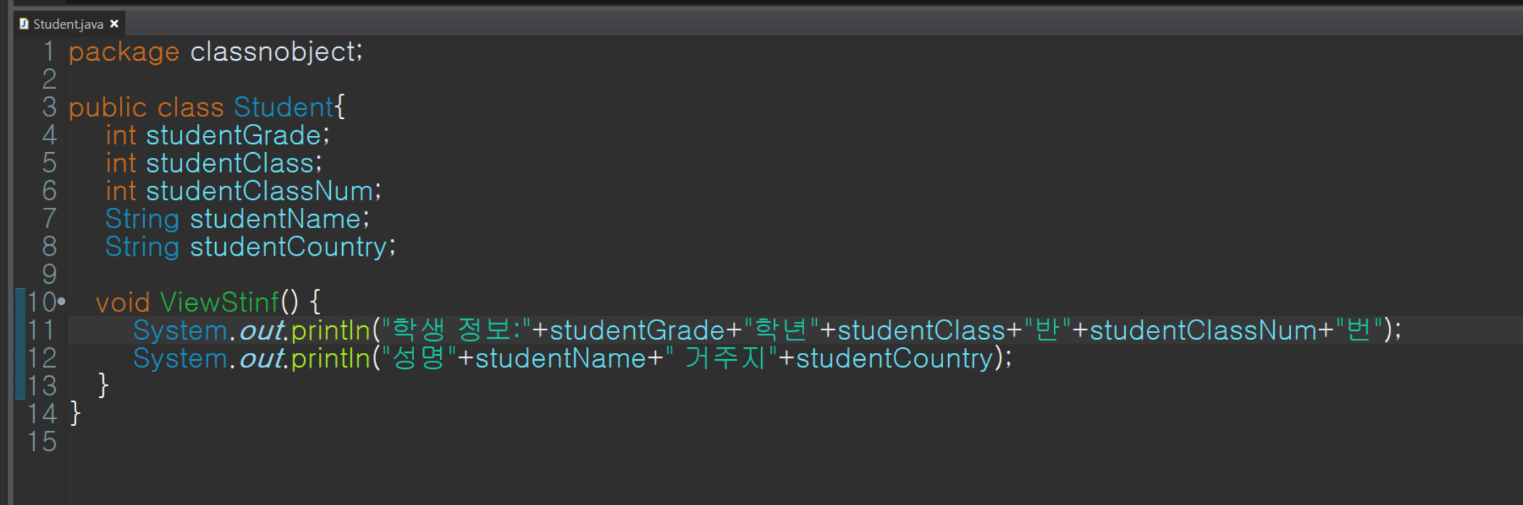System.out.println("성명"+studentName+" 거주지"+studentCountry);