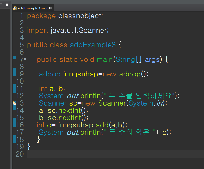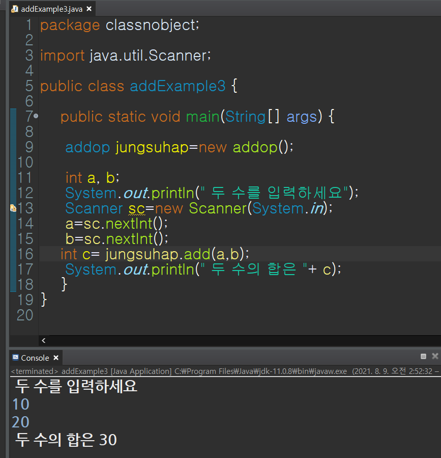 int c= jungsuhap.add(a,b); --> 두 수를 add 메소드로 보내서 출력값을 얻음