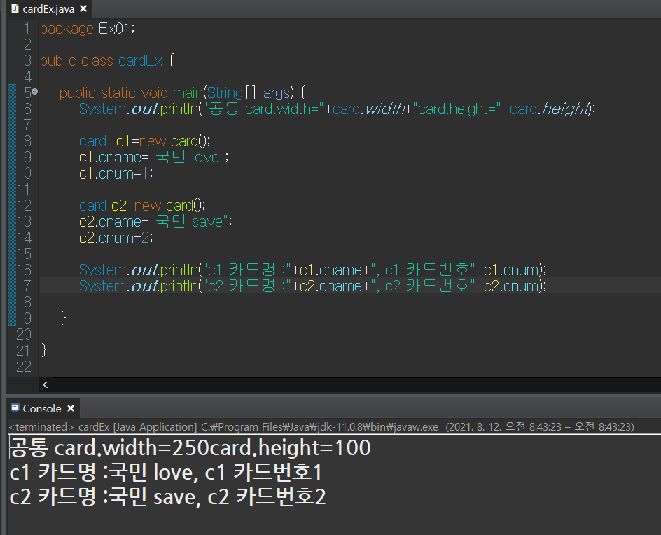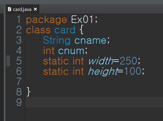 카드 클래스에서 cname, cnum 으로 인스턴스 변수를 만들고 static int width, static int height 클래스 변수를 만들었습니다. 인스턴스 변수는 변수 선언만 이루어진 것을 알 수 있고, 클래스 변수는 그에 해당하는 값까지 제시된 것을 알 수 있습니다.