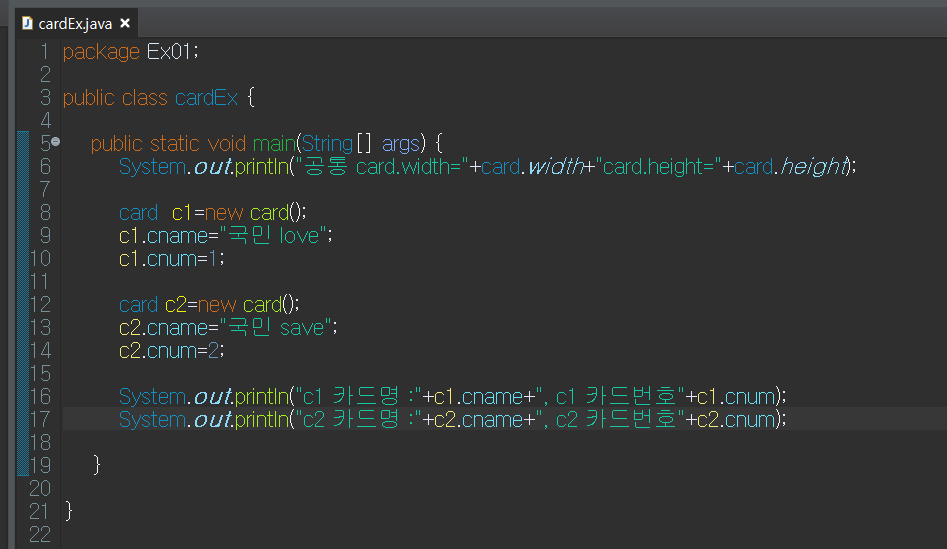 System.out.println("c1 카드명 :"+c1.cname+", c1 카드번호"+c1.cnum);