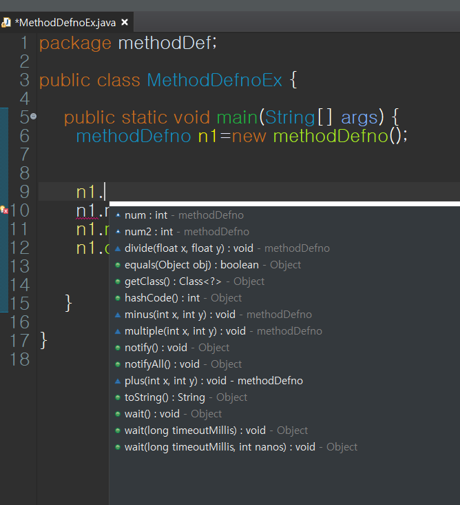 실행 클래스에서 객체 변수를 작성하고 . 연산자를 활용하면 활용한 메서드가 나옵니다. (자동완성)