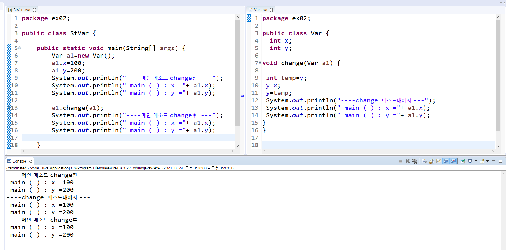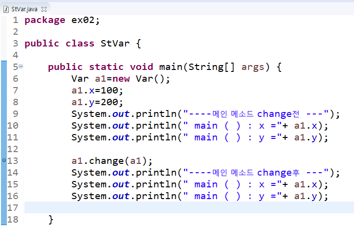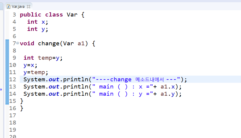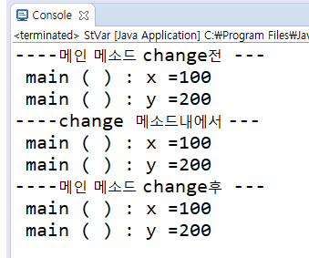 a1.change(a1); Var 클래스내의 메소드를 적용한 하여 적용된 멤버 변수 값이 변경된 후에도 메인 메소드에서 변경된 것을 볼 수 있습니다.