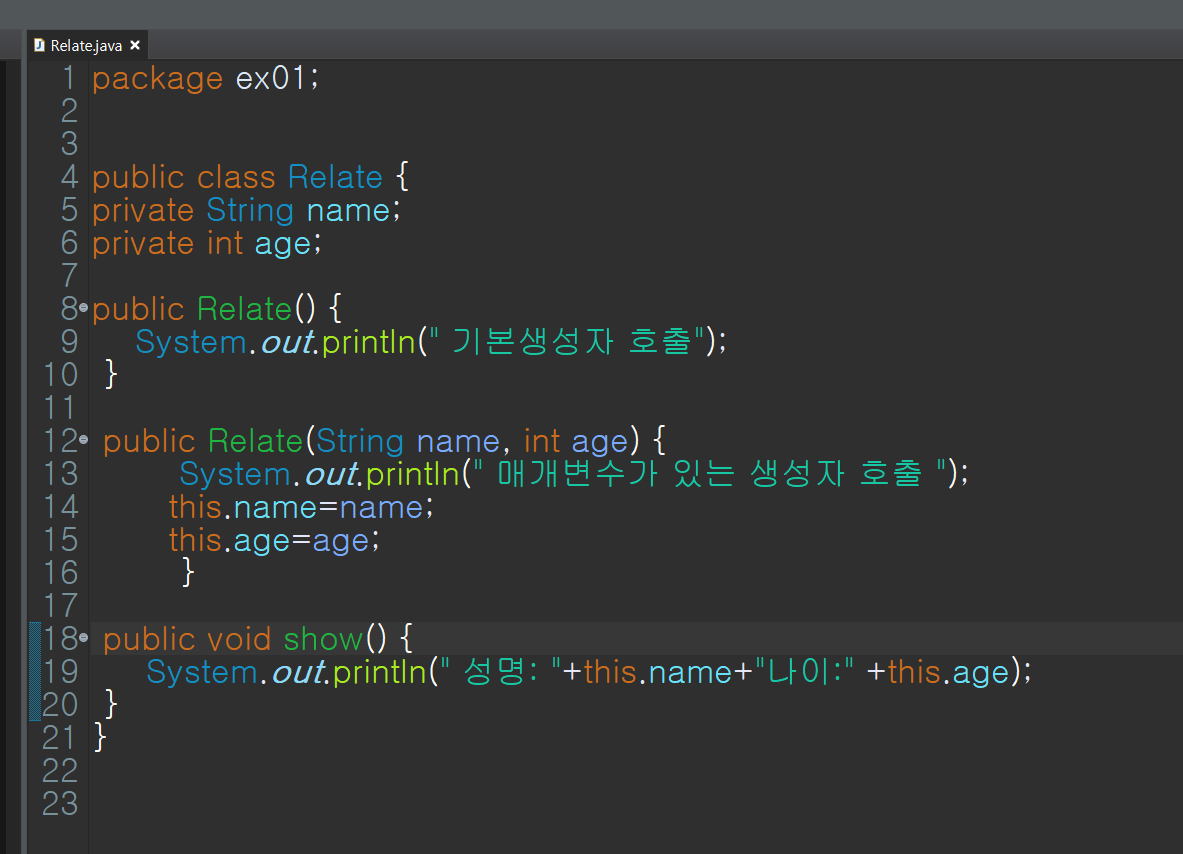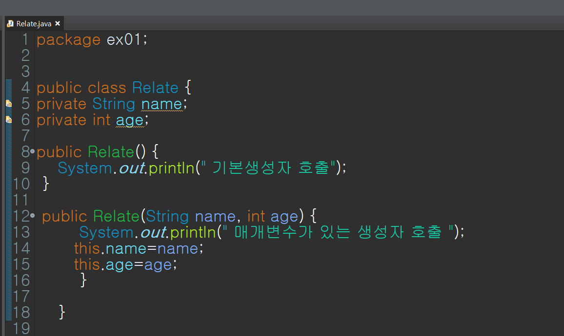 매개변수가 있는 생성자에는 public Ralate(String name, int age){}
