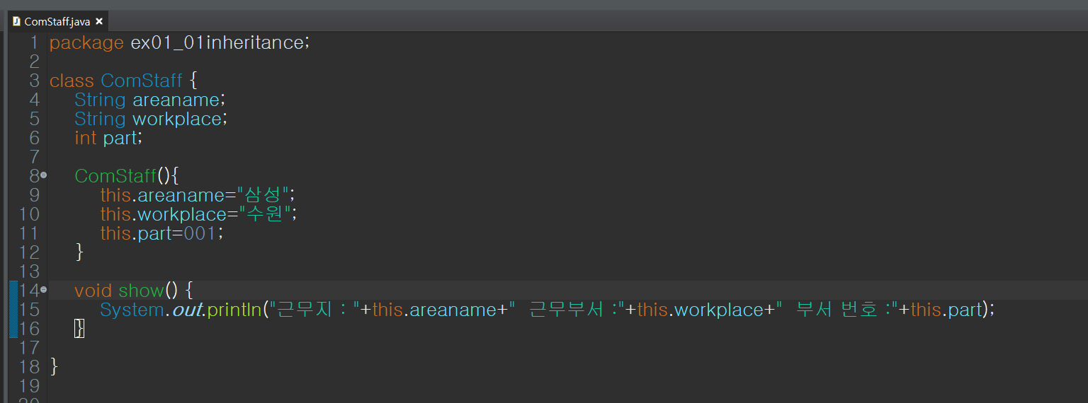 System.out.println("근무지 : "+this.areaname+" 근무부서 :"+this.workplace+" 부서 번호 :"+this.part);