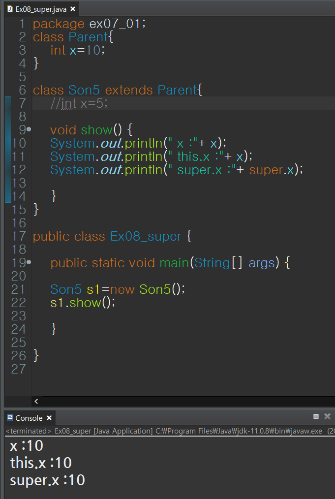 super는 조상 클래스 영역이므로 x=10이 출력됨.