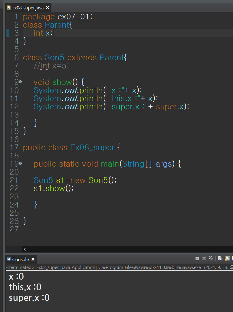 부모 클래스에서는 x=10 이고 자식 클래스 에서 x=5입니다.