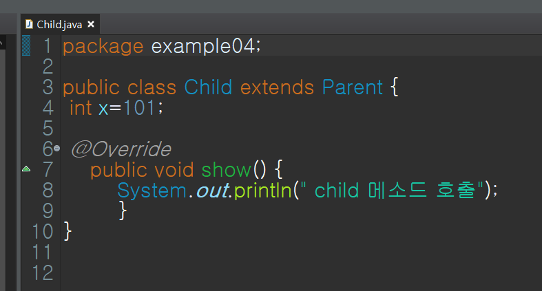 public void show() 부모 클래스의 show 메소드 상속 관계에 있는 메소드로 자식 메소드로 오버라이딩을 되었습니다.