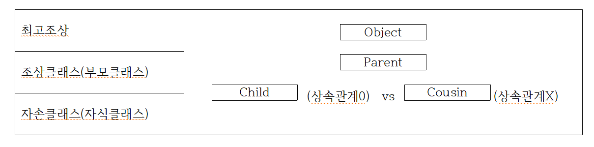 조상 클래스에서 오브젝트 클래스(최고조상)을 접근하는 경우는 당연히 형변환이 되기 때문에 참이 됩니다.