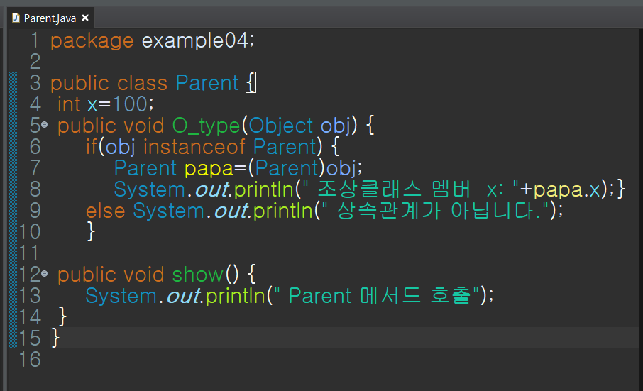 System.out.println(" 조상클래스 멤버 x: "+papa.x);}